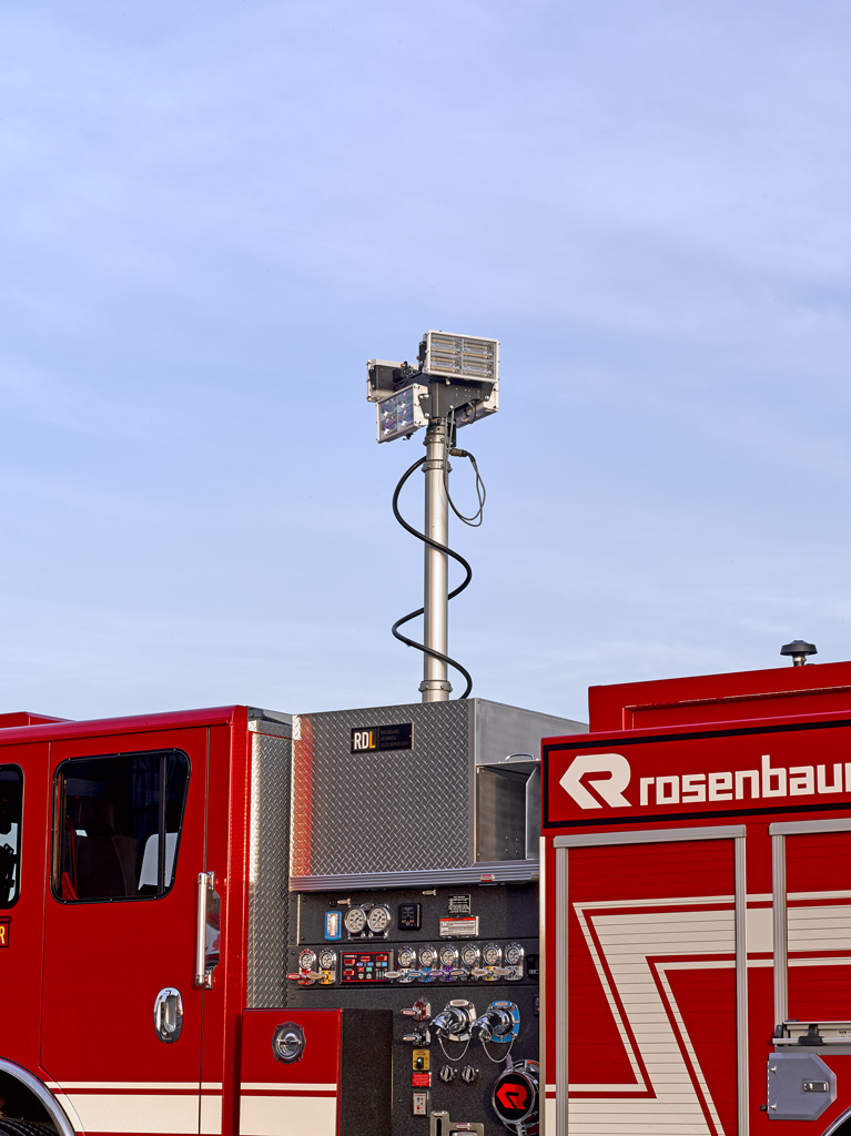 Rosenbauer's Rapid Deploy Light - RDL is an air actuated LED scene light tower capable of reaching 20'. The RDL is smart enabled, when initially deployed the RDL travels to 8' above the apparatus then stops and waits for manual command to continue taller.