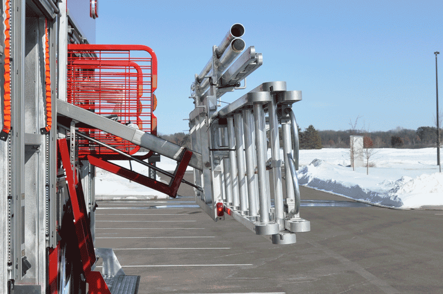 The Rosenbauer Lo Pro ground ladder storage rack brings your NFPA required ground ladders down to at least 48" from the ground to reduce the risk of injury on the fire ground.