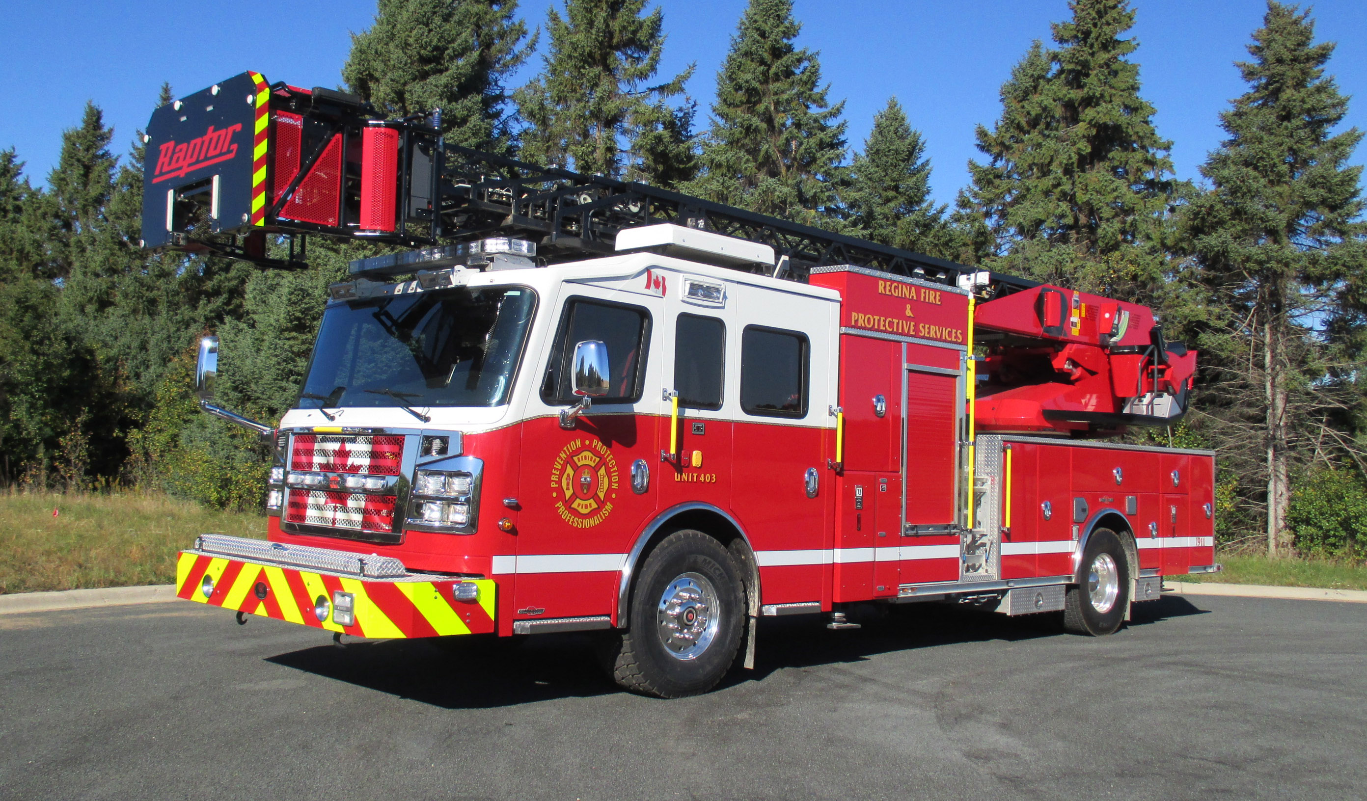 Rosenbauer's 105' Raptor aerial with CAN-Bus controls, folding rescue cage.