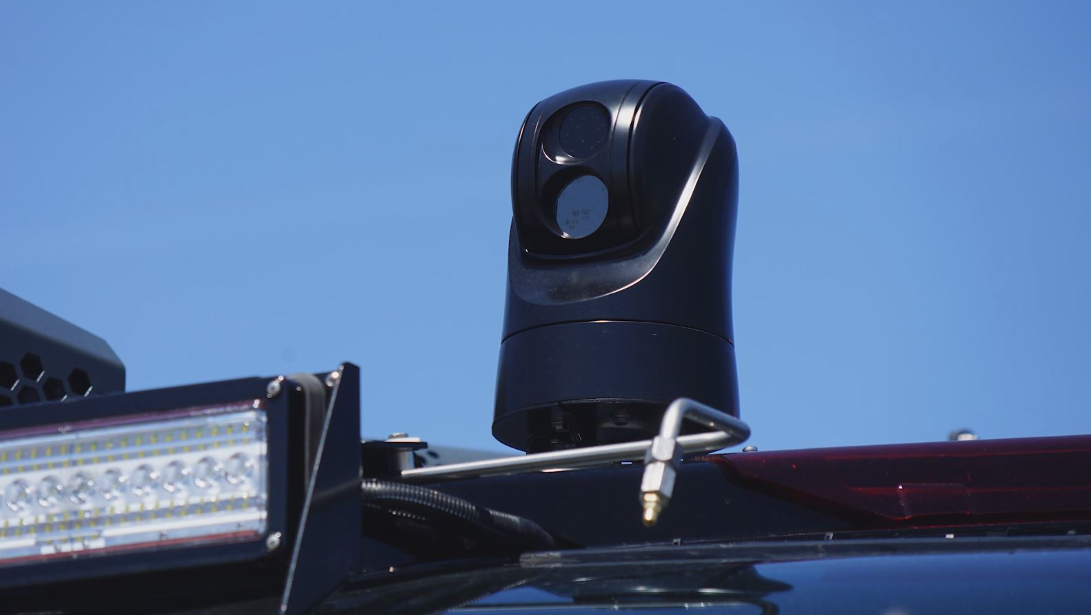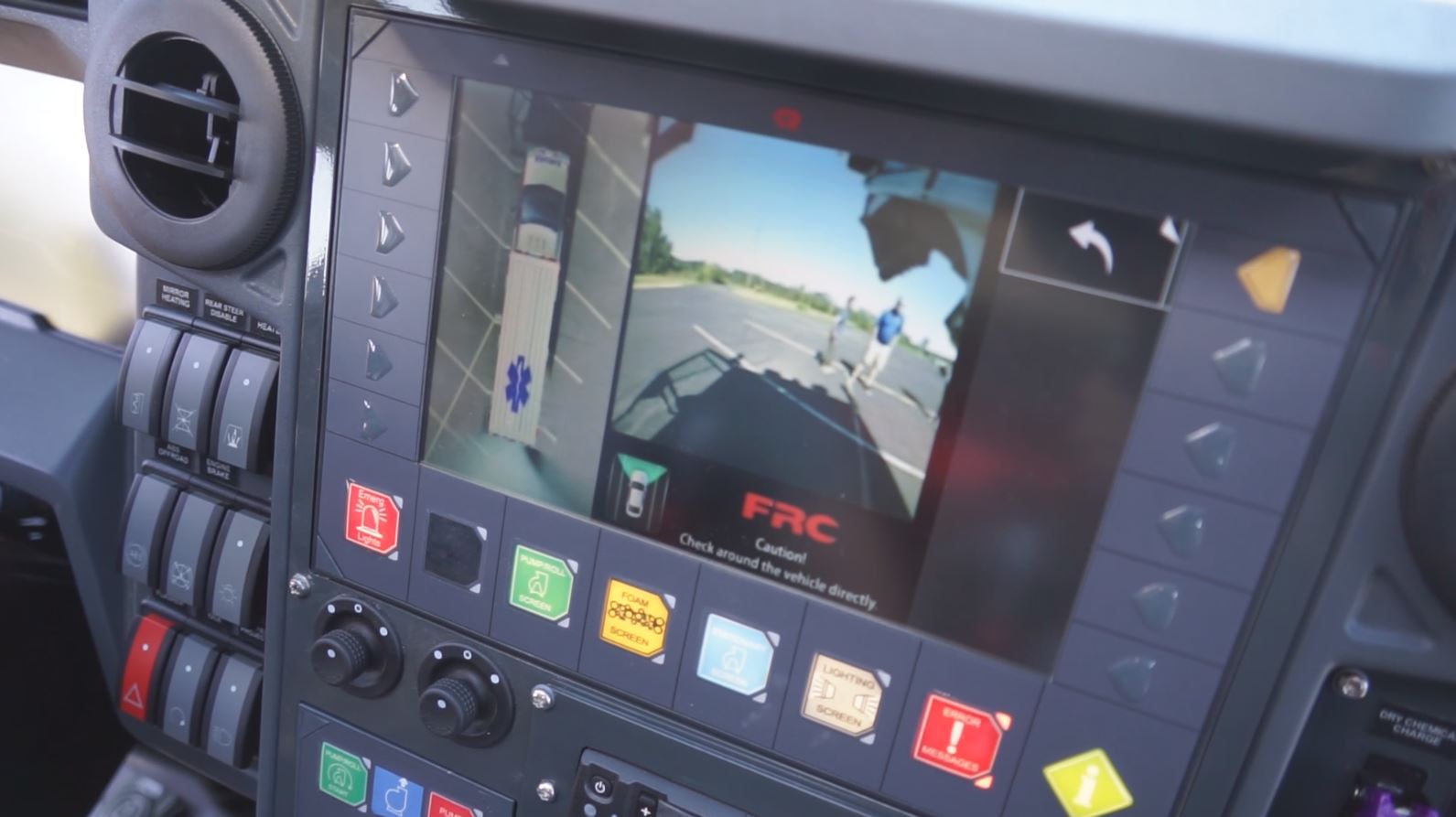 Rosenbauer Panther's exterior uses four cameras, one on each side of the truck to create a composite image. Providing a 360° live video view. The cameras can be used while the vehicle is in motion.