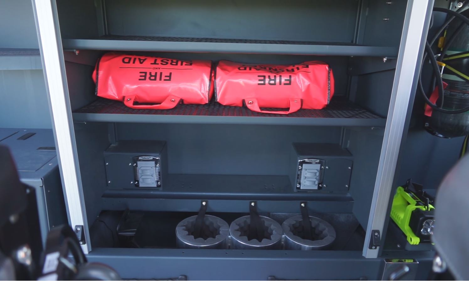 Rosenbauer's Panther cab is spacious enough for an on-board EMS cabinet for storing gear, data, spare SCBA bottles for example.