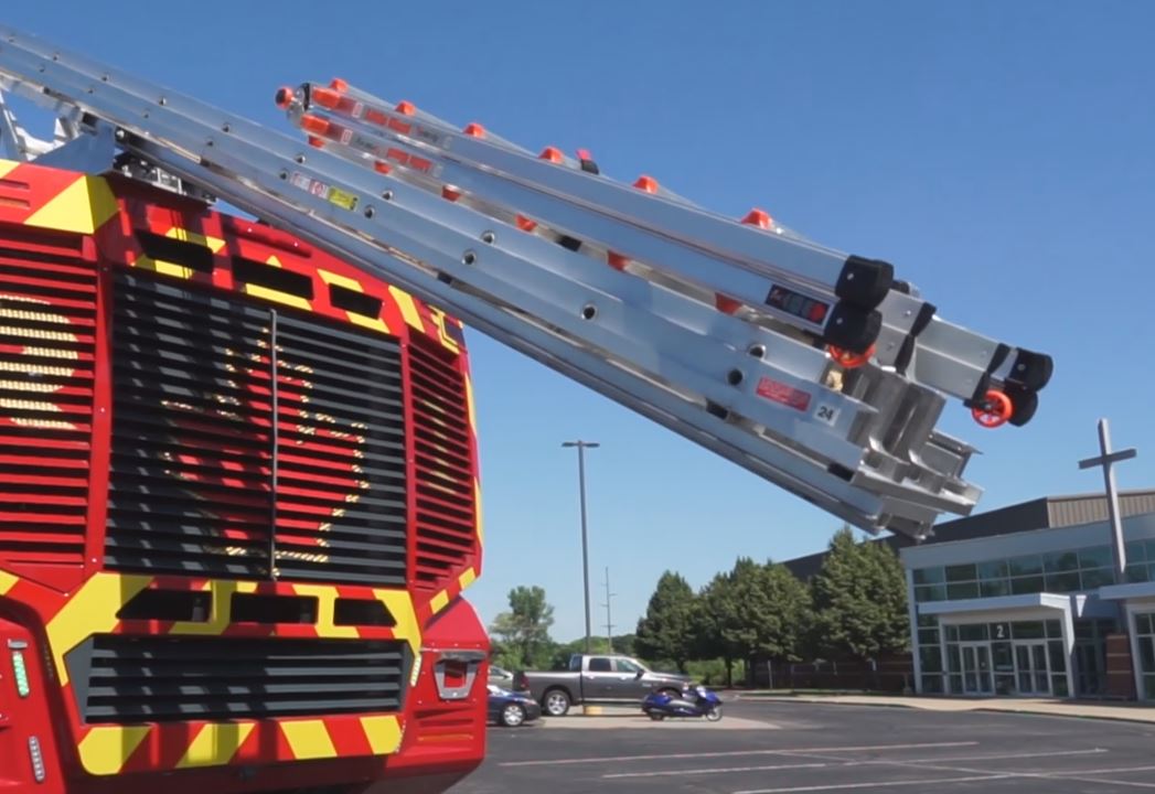 The Panther has an electric ladder storage feature which is powered by an electric over hydraulic ladder storage rack. Ladders are lowered to the rear of the apparatus.